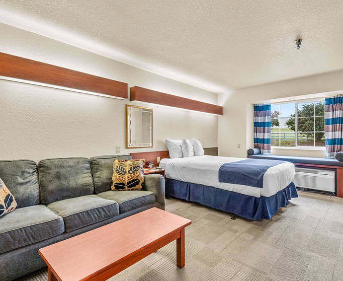 Free WiFi, free continental breakfast, roll-in shower, shower grab bars, adjustable hand-held shower wand, portable shower seat, raised toilet seat with grab bars, bedroom is wheelchair accessible, closet rods at wheelchair height,mini-refrigerator, microwave, air conditioning, HDTV, alarm clock, desk